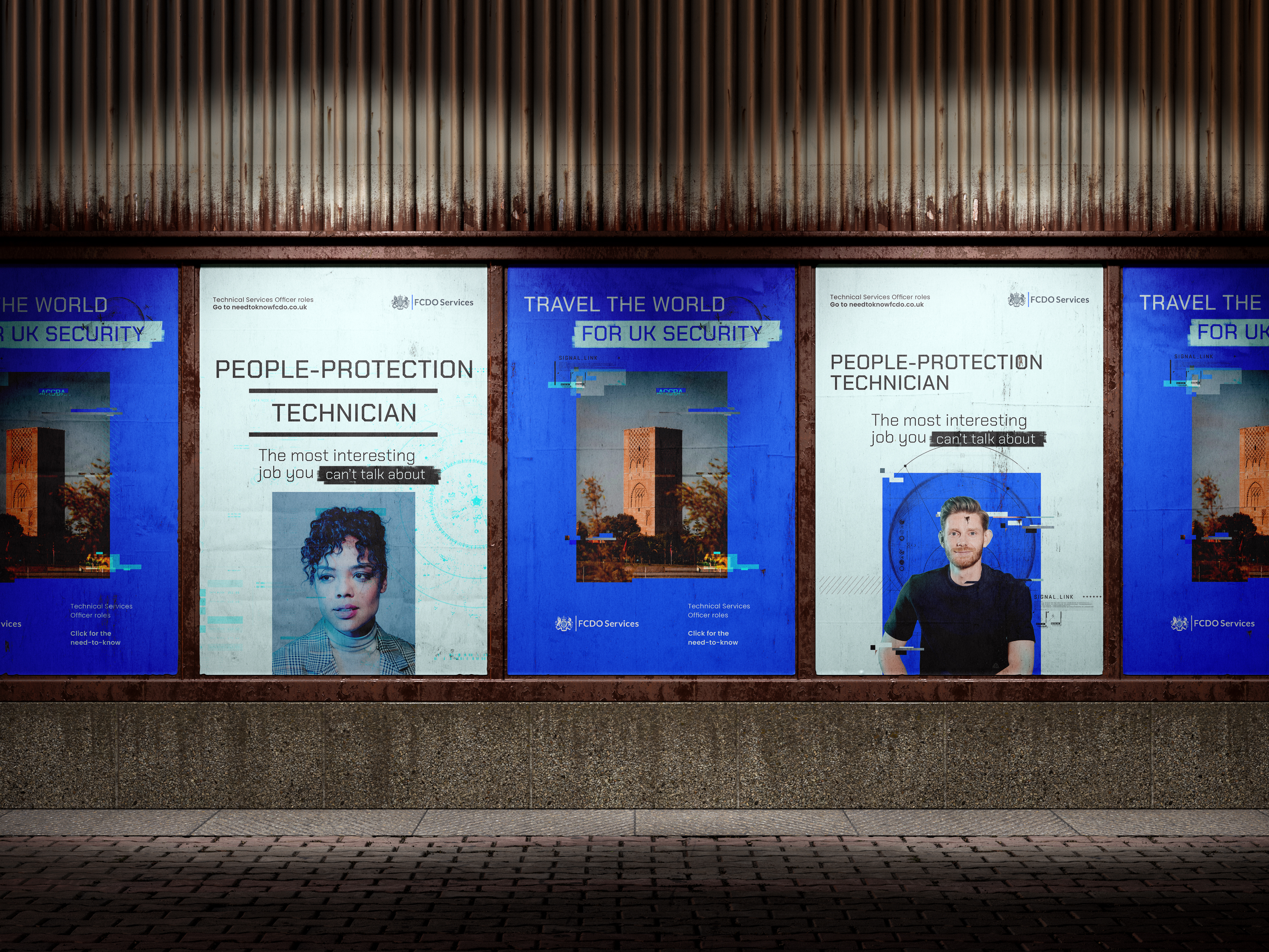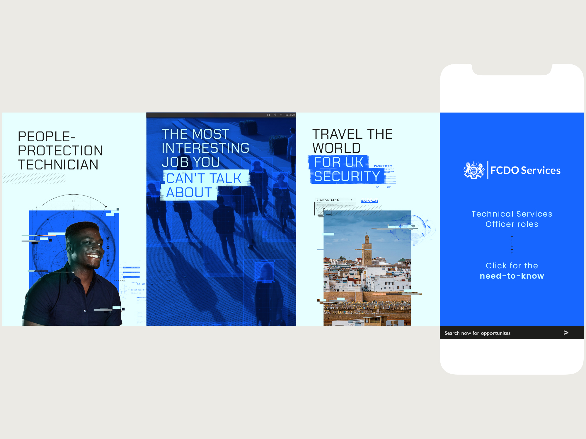 A new business pitch [ which was won ] for FCDO to drive applicants to apply for the role of Technical Services Officer. Bond-esque visuals such as redaction, glitching and spyware were used to heighten the secretive nature of the role. Photography of exotic locations spoke to the international travel on offer.